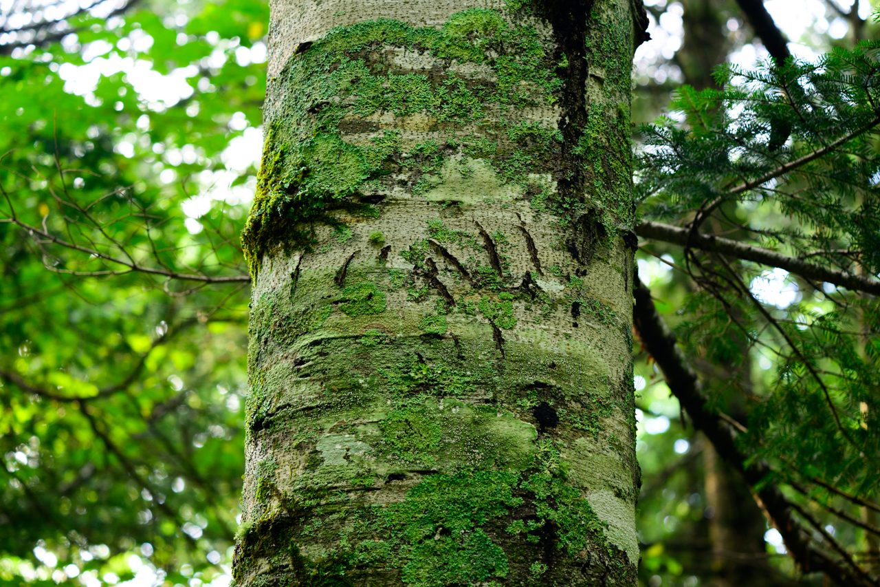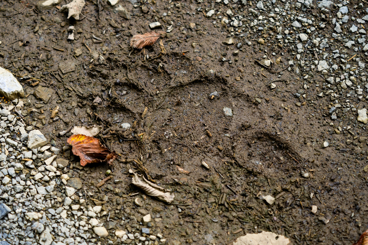 ヒグマとは100 mにも満たない距離で遭遇したが、幸いこちらに関心を示す様子はなく、そのまま茂みの奥へと姿を消していった。安全な距離を保ちながら様子を確認し、400 mmの焦点距離で茂みの中を撮影したところ、わずかに体の一部を捉えることができた(1枚目の写真)。2枚目の写真は、白樺の木の幹についたヒグマの爪痕を撮影したもので、3枚目の写真は足跡を映している。