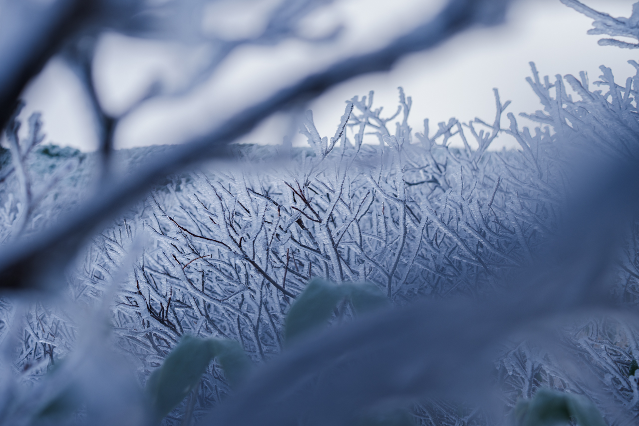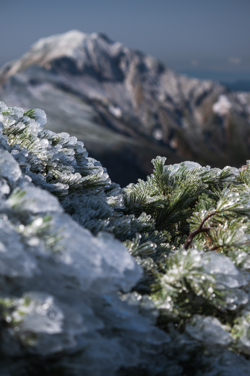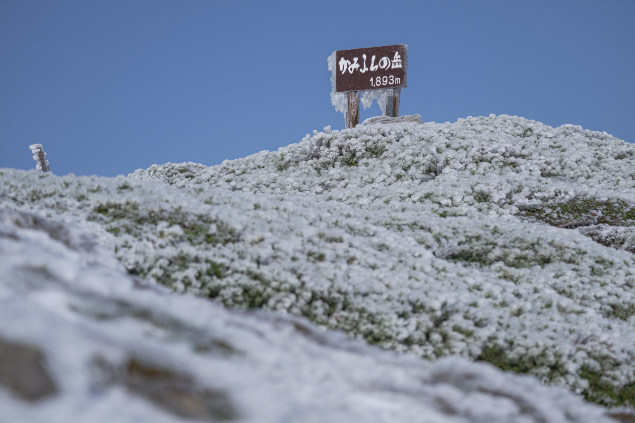 この日、凌雲閣側の登山口から上富良野岳に登り、十勝岳へ縦走する計画を立てていたが、景色に見とれて登山どころではなくなってしまった。山頂に近づくにつれて、景色は徐々に冬へと移り変わっていった。ハイマツは氷をまとって岩のように固まり、標識にも氷が張り付いていた。稜線はカリカリにクラストしており、持参したチェーンスパイクでは危険で、十二本爪のアイゼンが必要な状態だった。