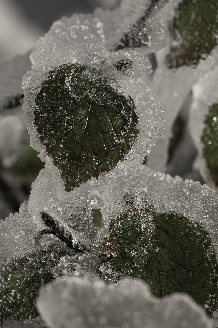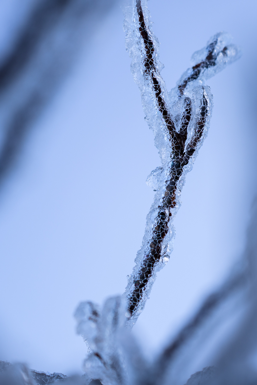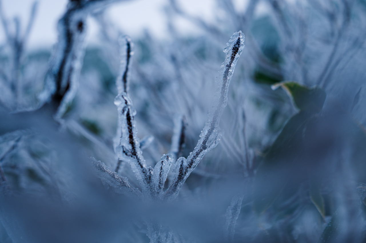 この日、凌雲閣側の登山口から上富良野岳に登り、十勝岳へ縦走する計画を立てていたが、景色に見とれて登山どころではなくなってしまった。山頂に近づくにつれて、景色は徐々に冬へと移り変わっていった。ハイマツは氷をまとって岩のように固まり、標識にも氷が張り付いていた。稜線はカリカリにクラストしており、持参したチェーンスパイクでは危険で、十二本爪のアイゼンが必要な状態だった。